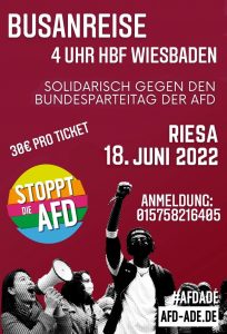 „Die AfD ist zwar eine demokratisch gewählte Partei, von demokratischen Inhalten aber weit entfernt. Es ist unsere Pflicht – vor allem mit Blick auf die deutsche Geschichte – uns Rassist*innen und Faschist*innen entschieden in den Weg zu stellen. Das muss auch die Stadt Wiesbaden einsehen und sich hinter die Proteste stellen“, erklärt Hofmann.