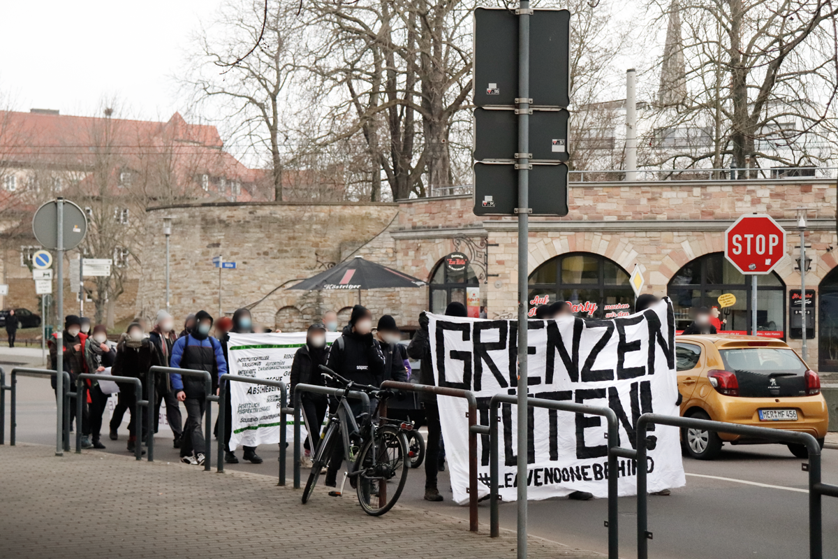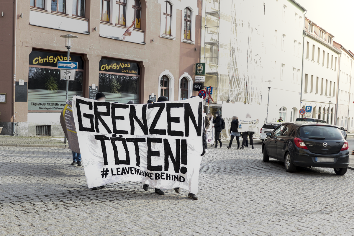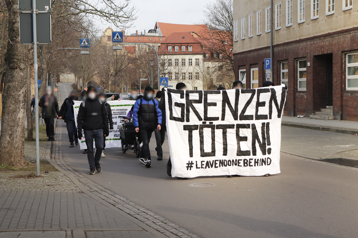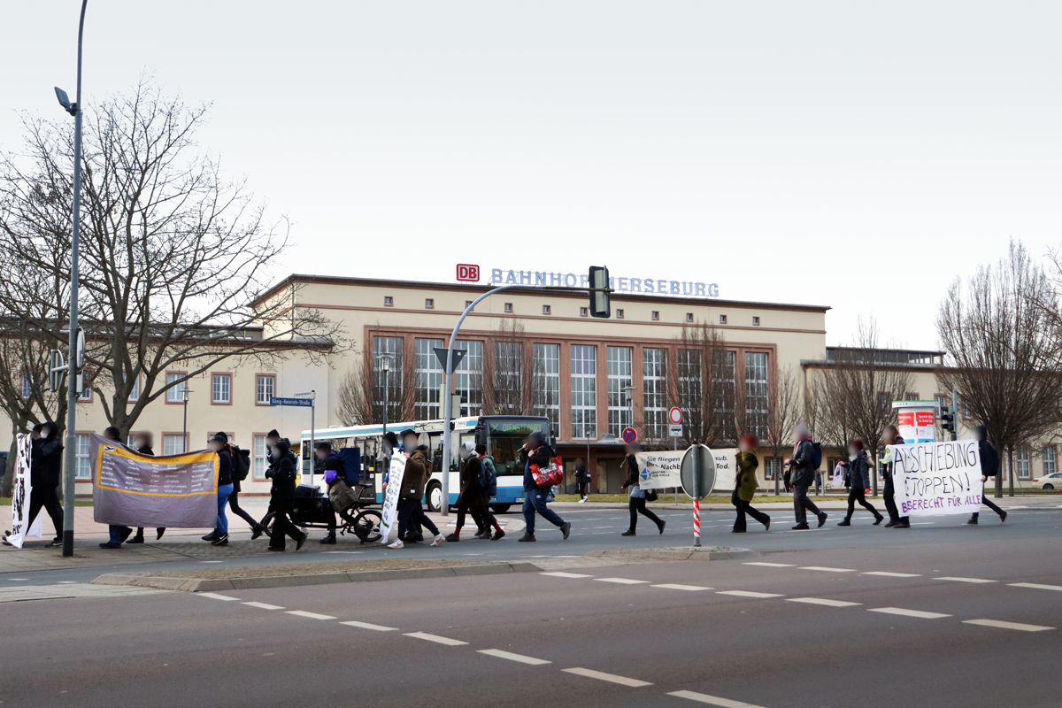 Die Verantwortlichen wurden am vergangenen Dienstag, den 9. März 2021, addressiert: in einer spontanen Demonstration trugen etwa 20 Personen ihre Wut anklagend auf die Straße. Um 15 Uhr startete die Versammlung auf dem Merseburger Entenplan und postierte sich vor dem dortigen SPD-Parteibüro. Auch die sozialdemokratische Partei toleriert Abschiebungen, anstatt geflüchteten Menschen hier im Saalekreis wirksam Sicherheit zu gewähren. Der kleine, aber laute Demonstrationszug machte anschließend vor dem Parteibüro der CDU Halt. Die “christlich-demokratische” Union verantwortet mit ihrer Identitäts- und Heimatpolitik die grausamen Abschiebungen aus Deutschland. Sie nimmt bewusst in Kauf, dass z.B. Familien getrennt werden, Menschen Schaden an Leib und Seele erleiden oder gar ihre “Rückkehr” mit dem Tod bezahlen. Und das alles um vermeintlich besorgte Bürger:innen zu hofieren und Wähler:innenstimmen zu sammeln. Einzige Reaktion aus dem CDU-Büro war ein aus dem Fenster gerufenes, empörtes “Das ist Sachbeschädigung!”, als eine Person mit abwaschbarem Kreidespray “Kein Mensch ist illegal” auf den Weg vor der Eingangstür sprühte. Ein Anwohner applaudierte den politischen Forderungen der Demonstration zustimmend, andere der an diesem sonnigen Tag zahlreichen Passant:innen reagierten gleichgültig, manchmal neugierig. Zu Anfeindungen oder Polizeibelästigung kam es nicht.