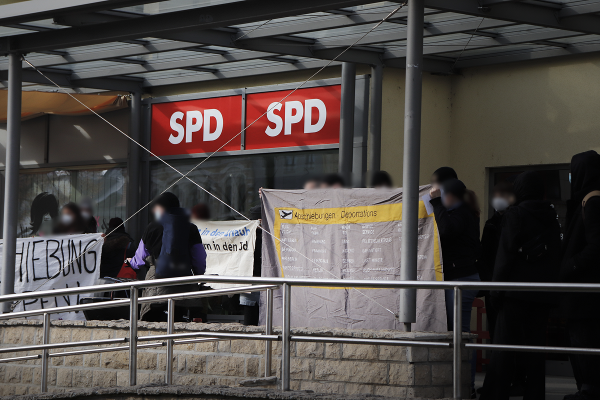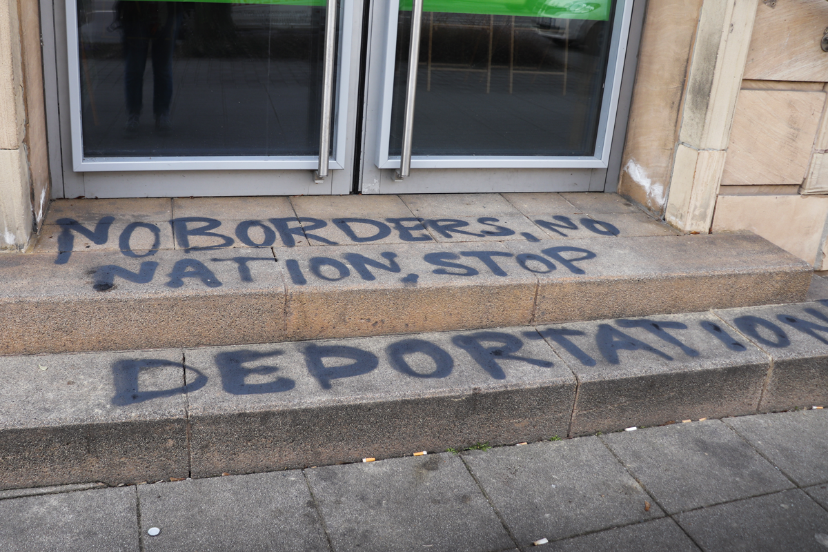 Letzte Station der mit Bannern bestückten Demonstration war das Grünen-Büro am Bahnhof Merseburg. Denn auch wenn sich die Grünen gerne sozial und gerecht geben, so sind auch sie mitverantwortlich für die Abschiebungen. Sie tragen die Abschiebepraxis mit, um politisch koalieren zu können. Diese Mitschuld klagte die Demonstration an. Nach einer knappen halben Stunde löste sich die spontane Versammlung wieder auf. Zurück blieben Plakate und Texte an den Fensterscheiben der Verantwortlichen.